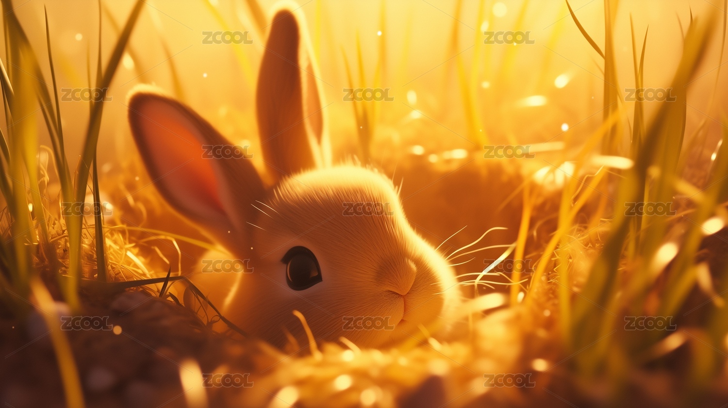 一只小兔子在黄昏的草丛中,3D卡通插画
