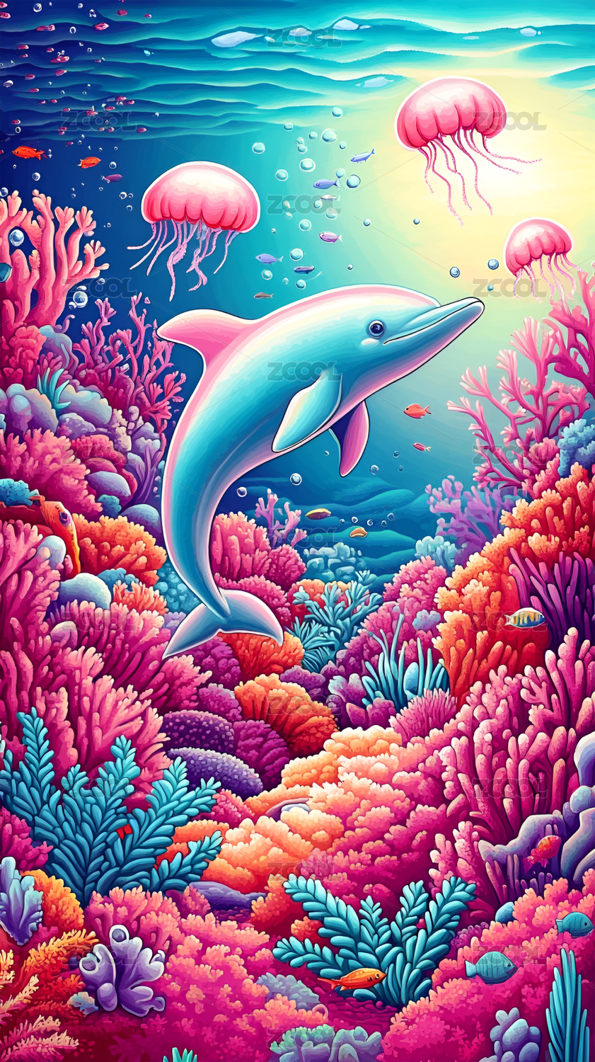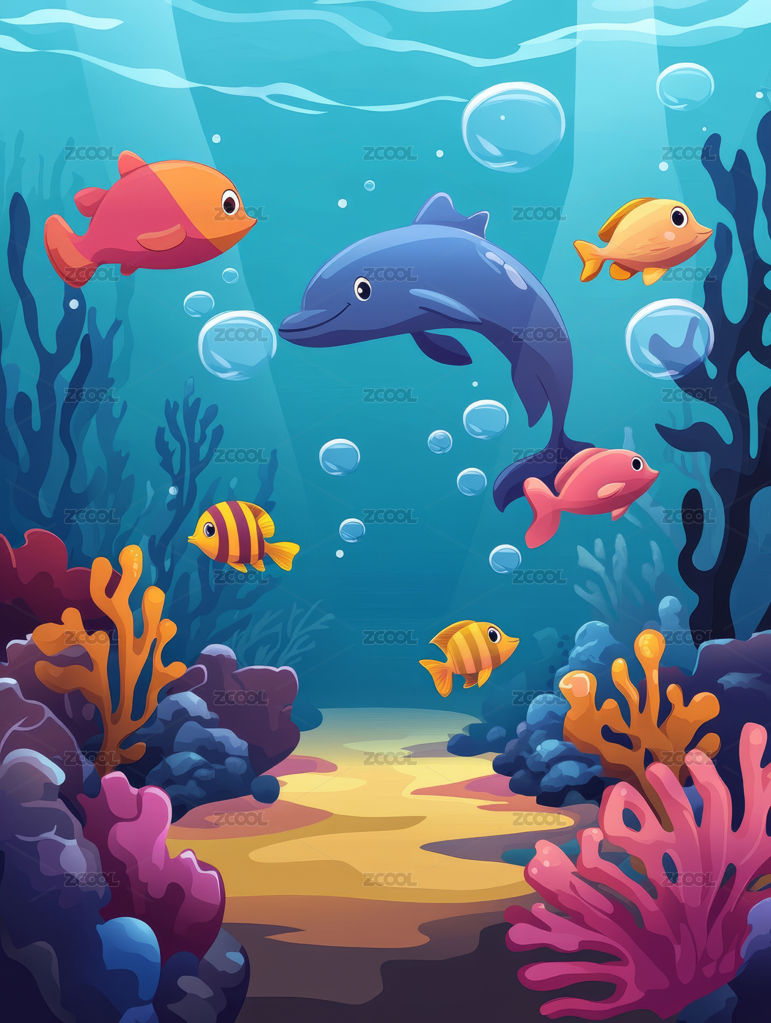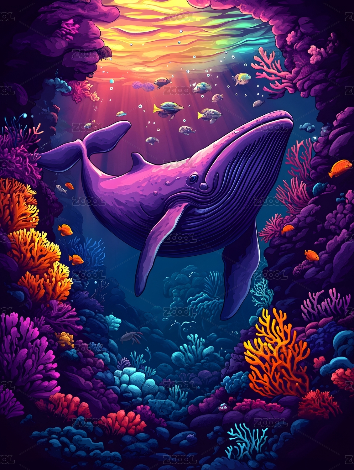鲸鱼,珊瑚,海洋,海底,鱼,水母,海星,海底世界,卡通,插画
