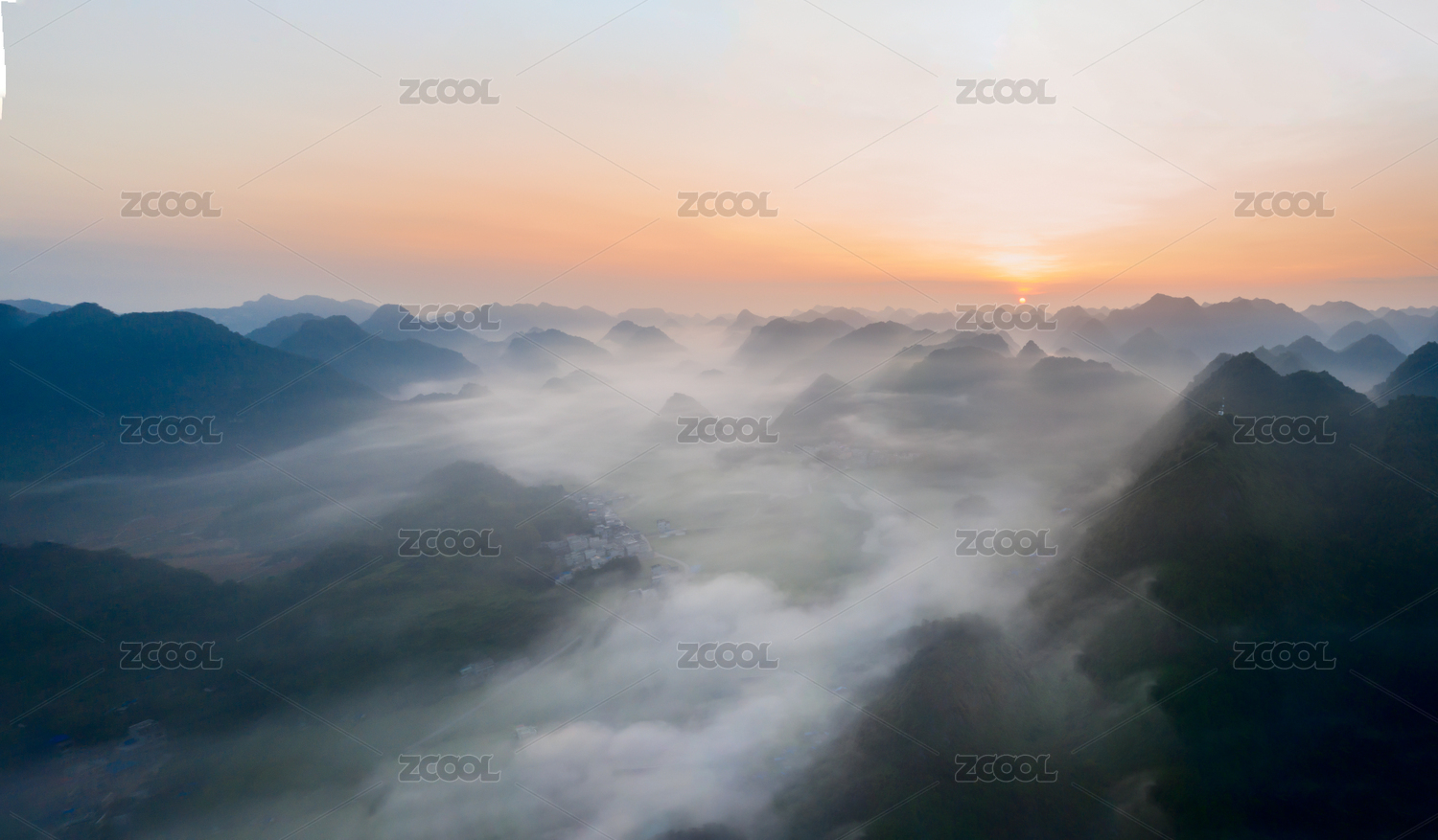 航拍中国广西桂林日出时喀斯特山脉晨雾风光