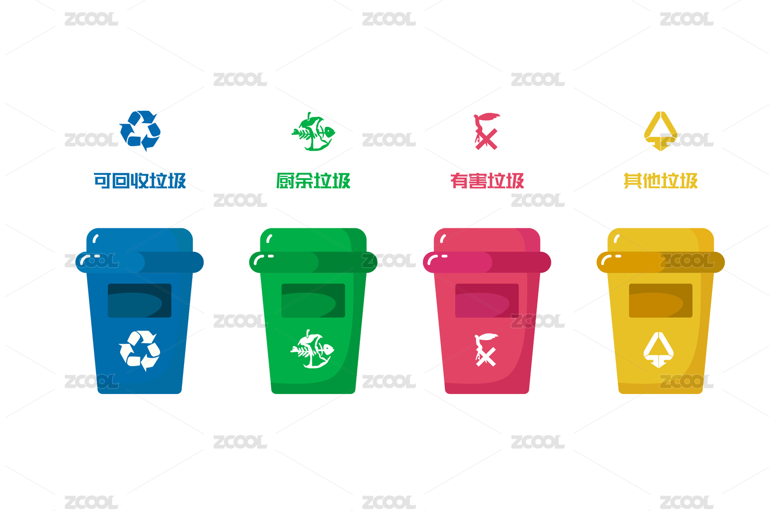 垃圾分类垃圾桶矢量插画元素和垃圾分类图标