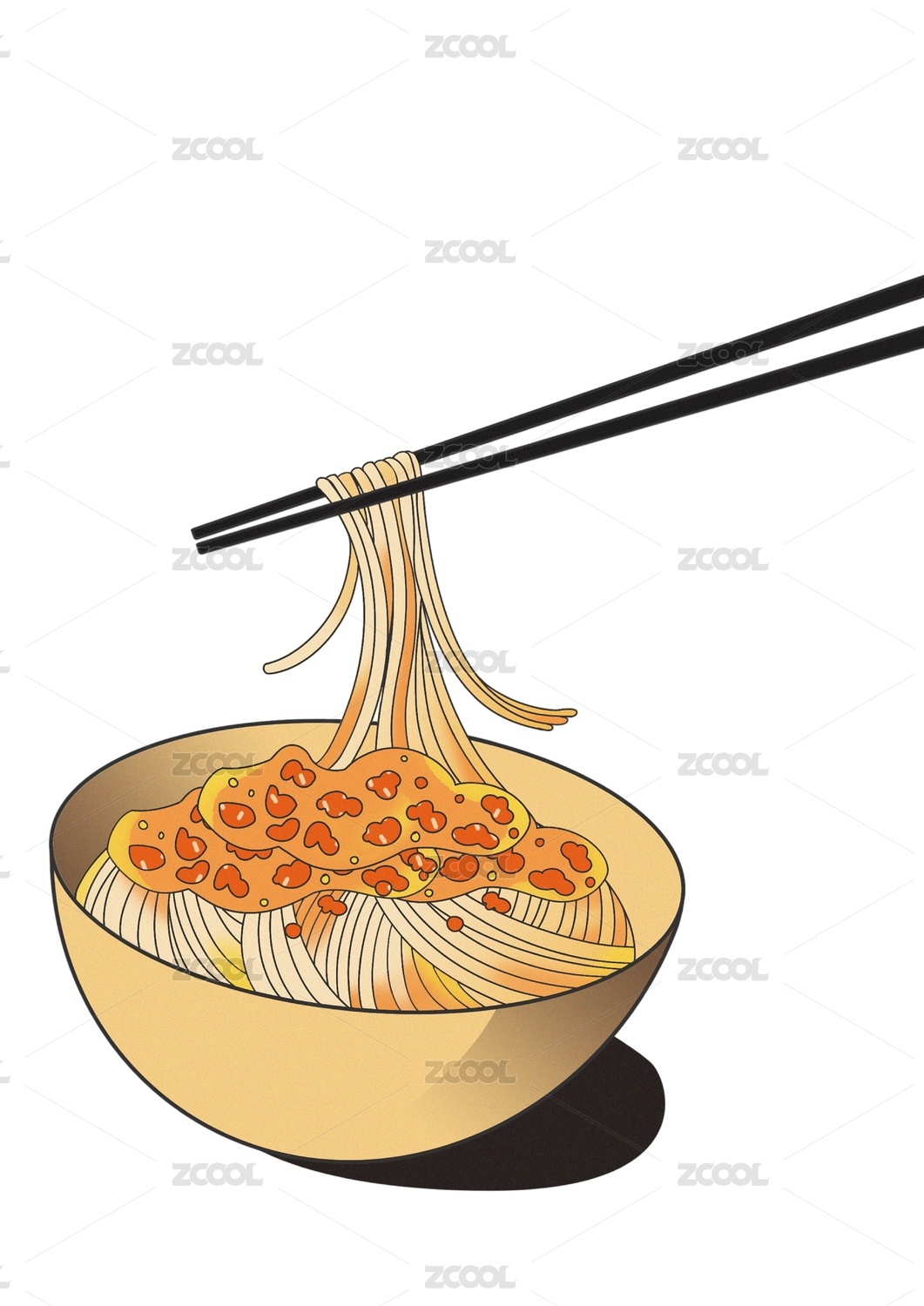 筷子挑起一碗诱人的米粉面条干拌面小吃手绘