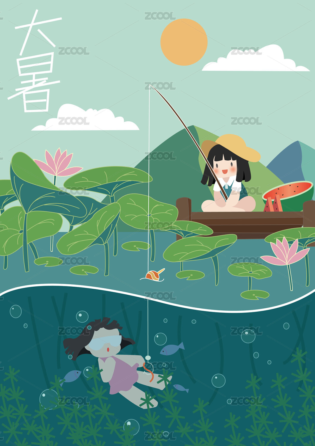 插画大暑绿色荷花女孩河边鱼蜻蜓露珠坐着