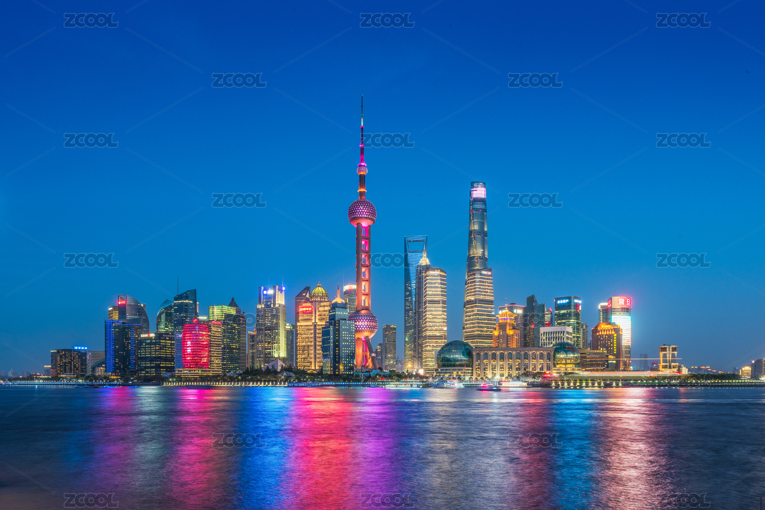 中国上海市中心建筑风光和黄埔江河流在夏季