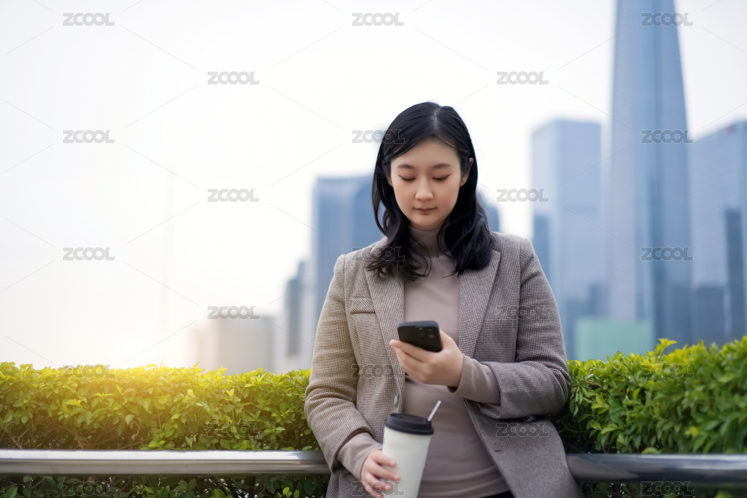 在城市里拿着智能手机和咖啡的年轻女子