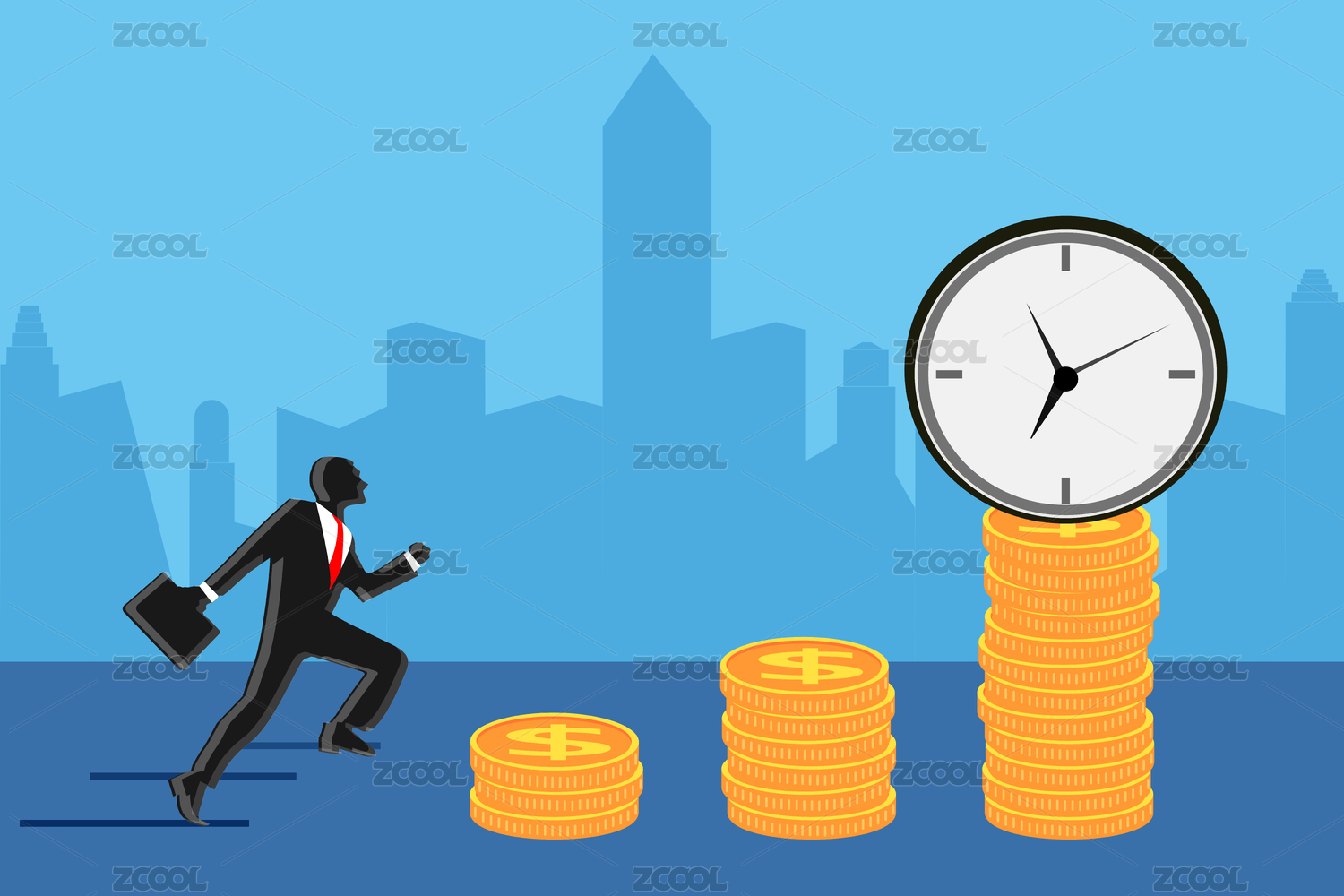 一个奔跑的商务男人、钟表与金币,现代城市建筑背景插画
