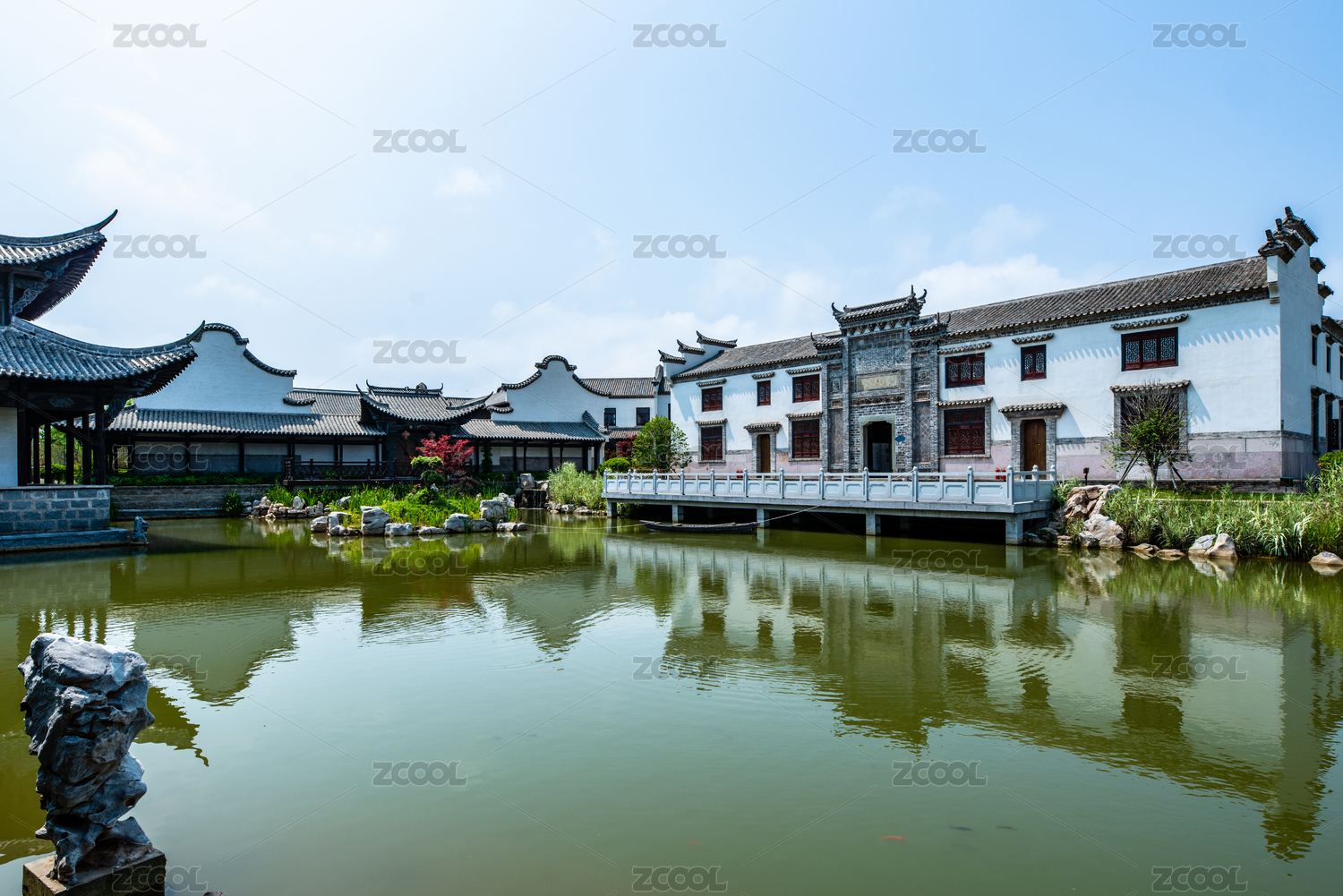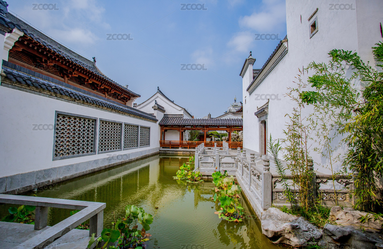 江苏木渎古镇苏州园林秀野园池塘和建筑