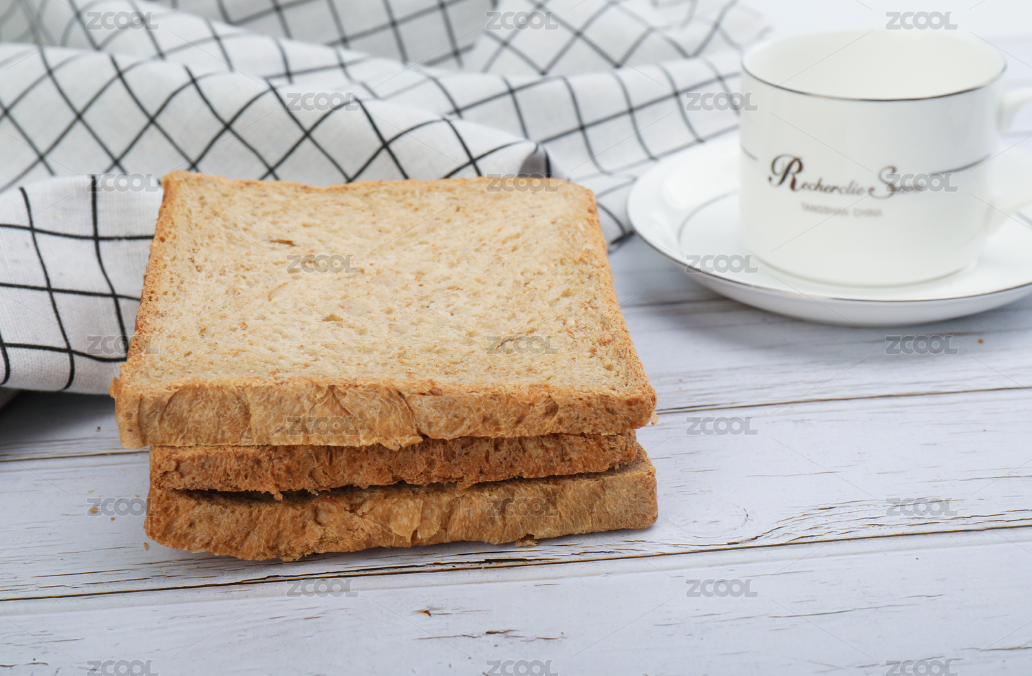 棚拍室内桌面上的玻璃杯牛奶面包片