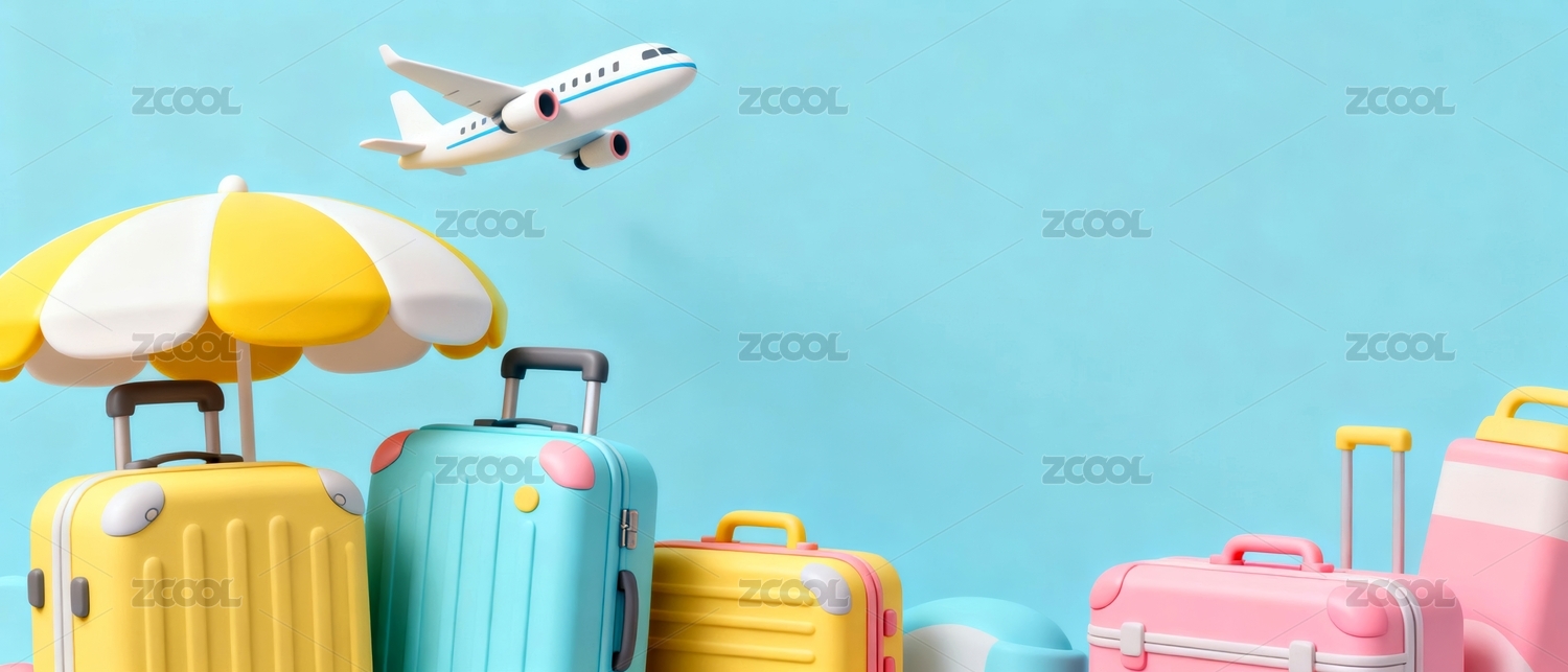 旅游主题纯色背景下的旅行箱、草帽和飞机