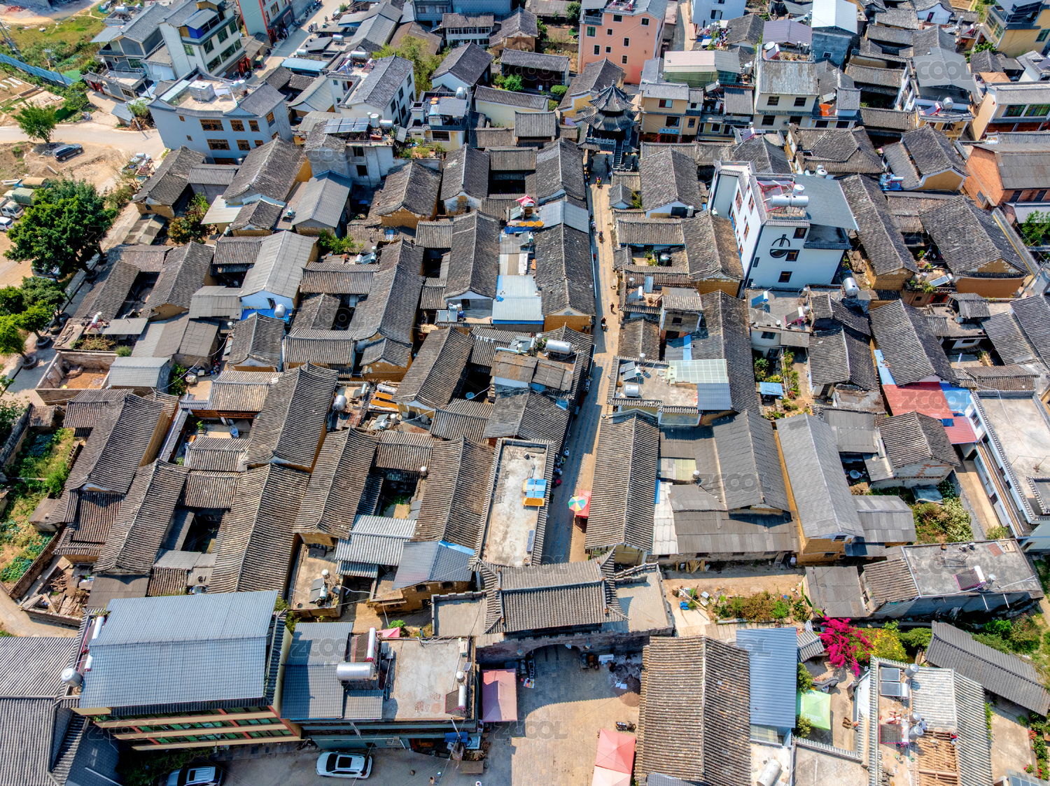云南大理喜洲古镇的白族瓦房四合院鸟瞰图