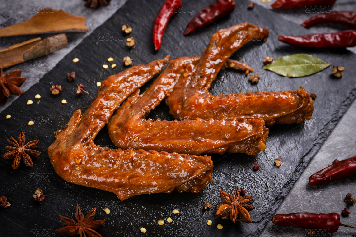 黑色石盘上的卤味鸡翅鸭翅