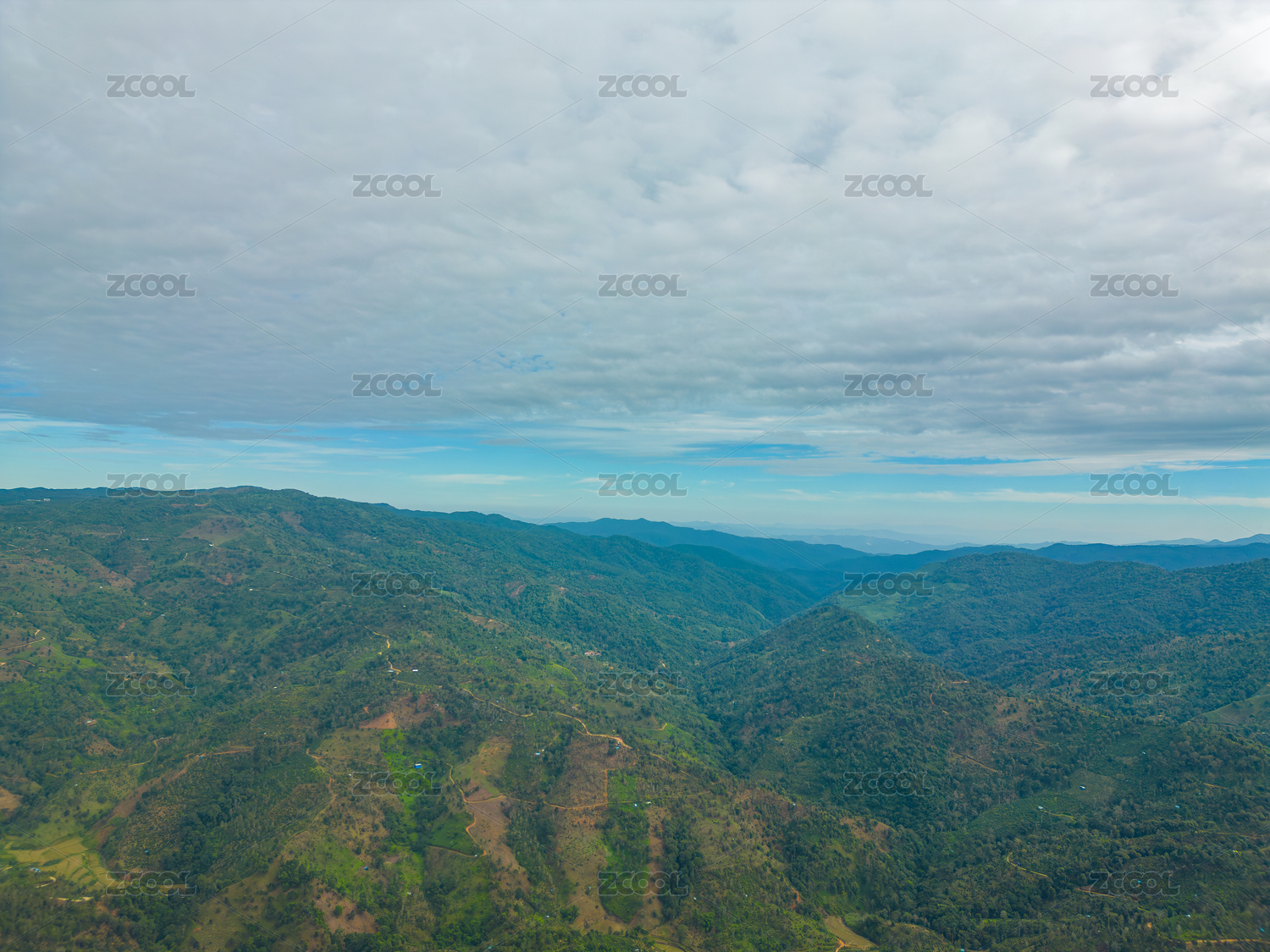 航拍蓝天白云下的景迈山山脉自然风光