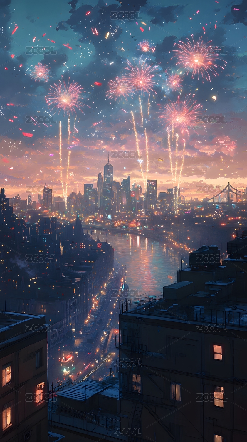 城市风光与烟花