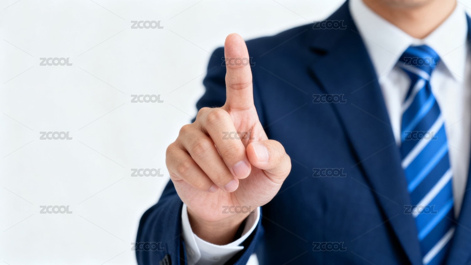穿着黑色正装打着领带的男士伸出食指在镜头前做点击手势