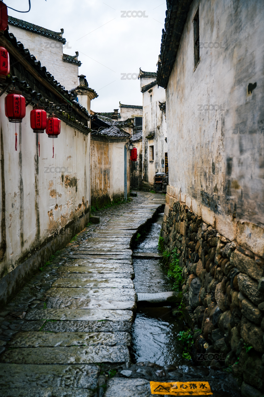 安徽黄山宏村徽派古典建筑的青石板路巷子
