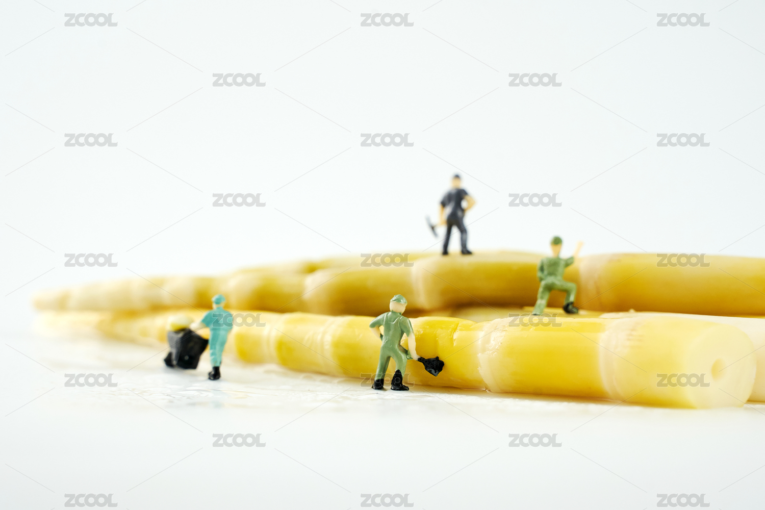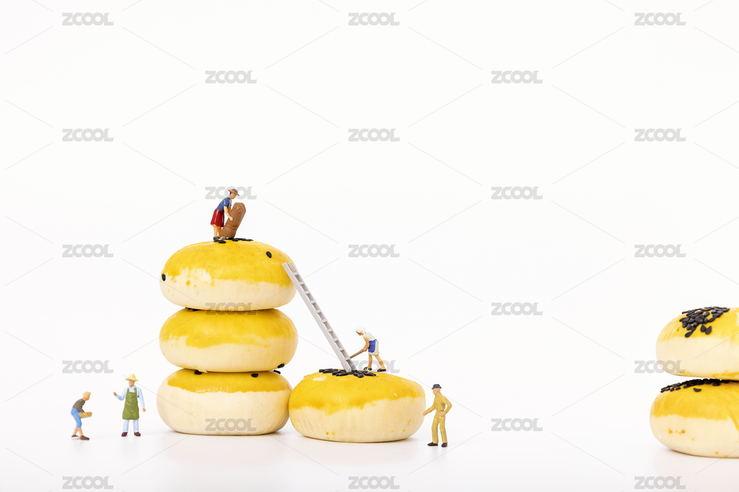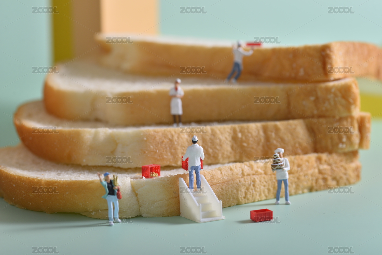 纯色背景上与吐司面包片一起忙碌的小人们。