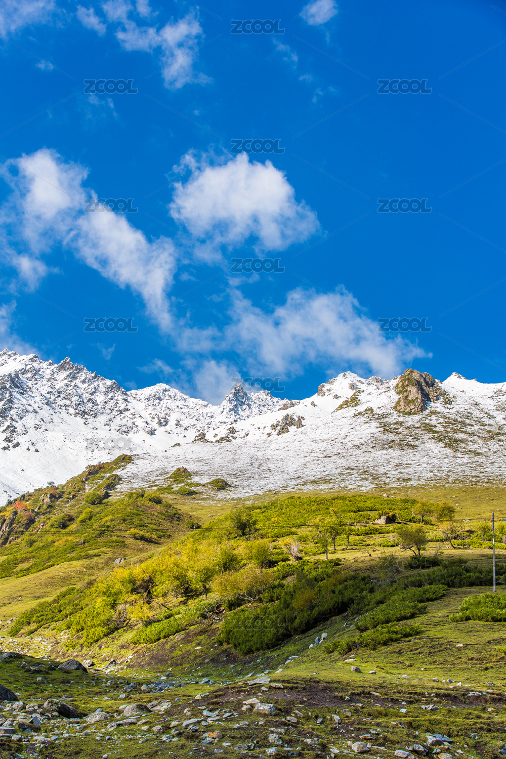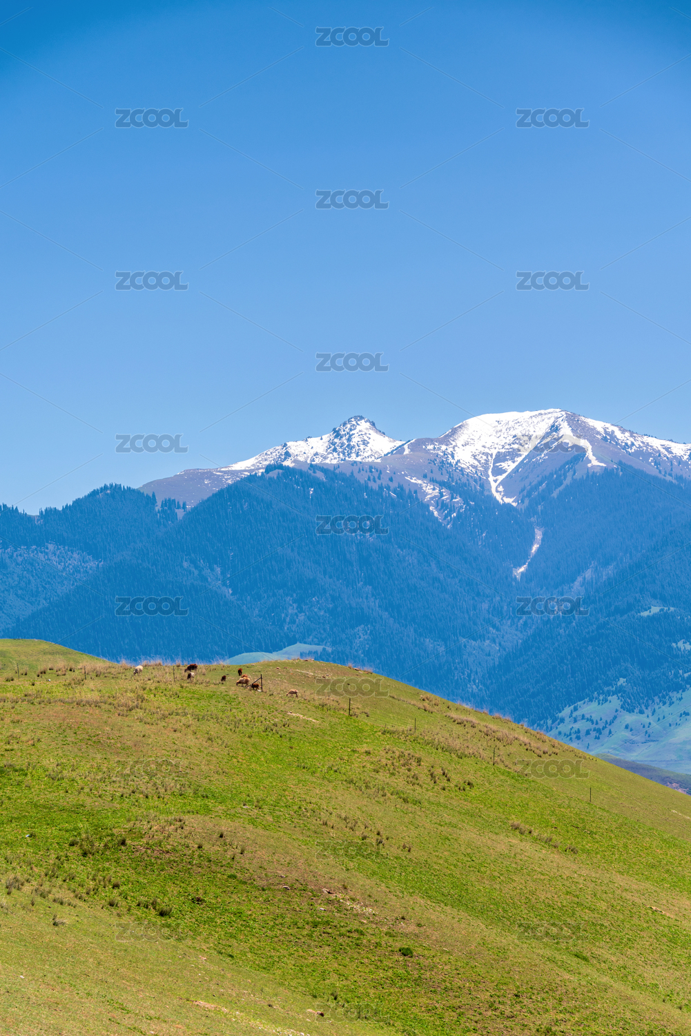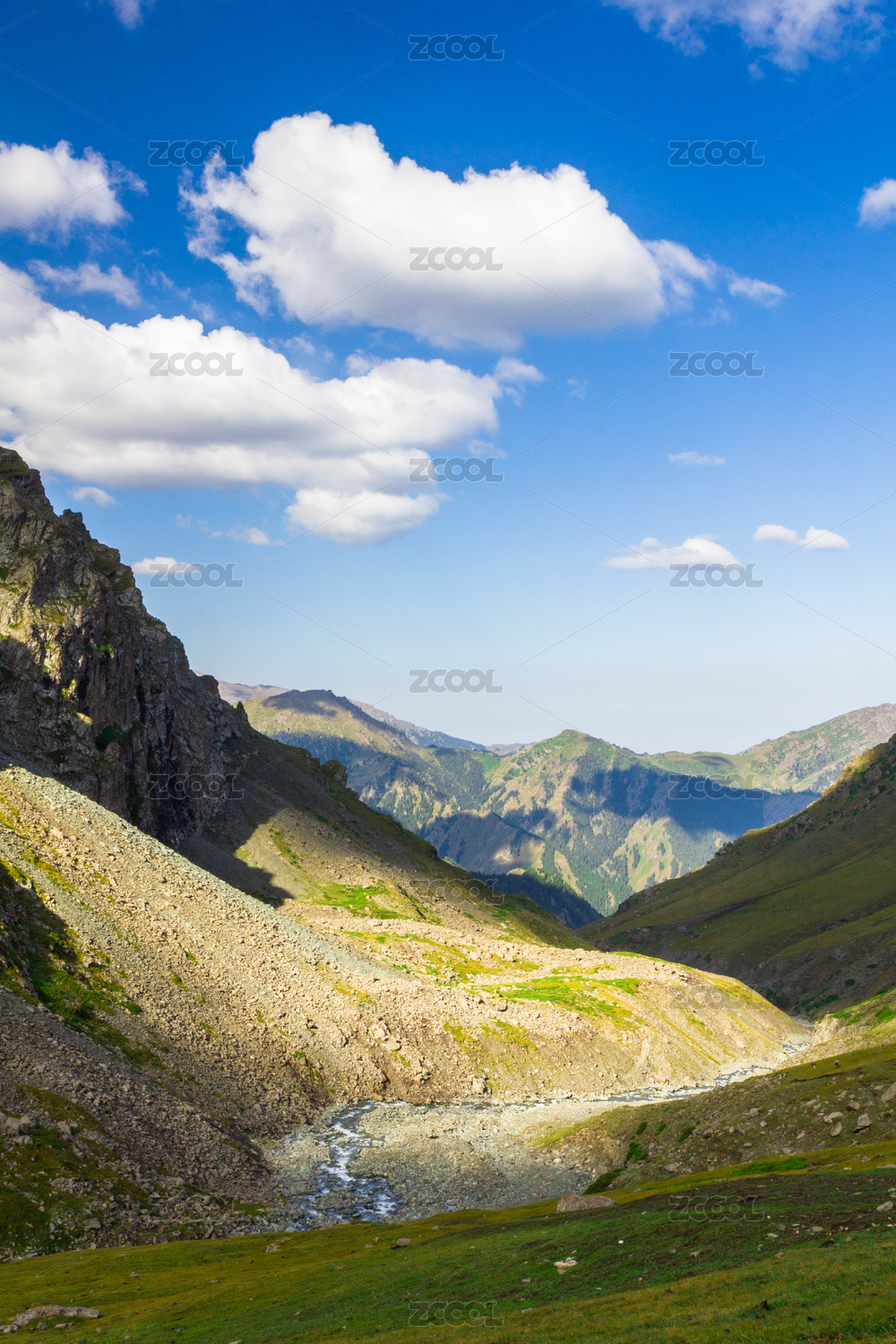 中国新疆夏季蓝天白云下G217独库公路沿途高山草原