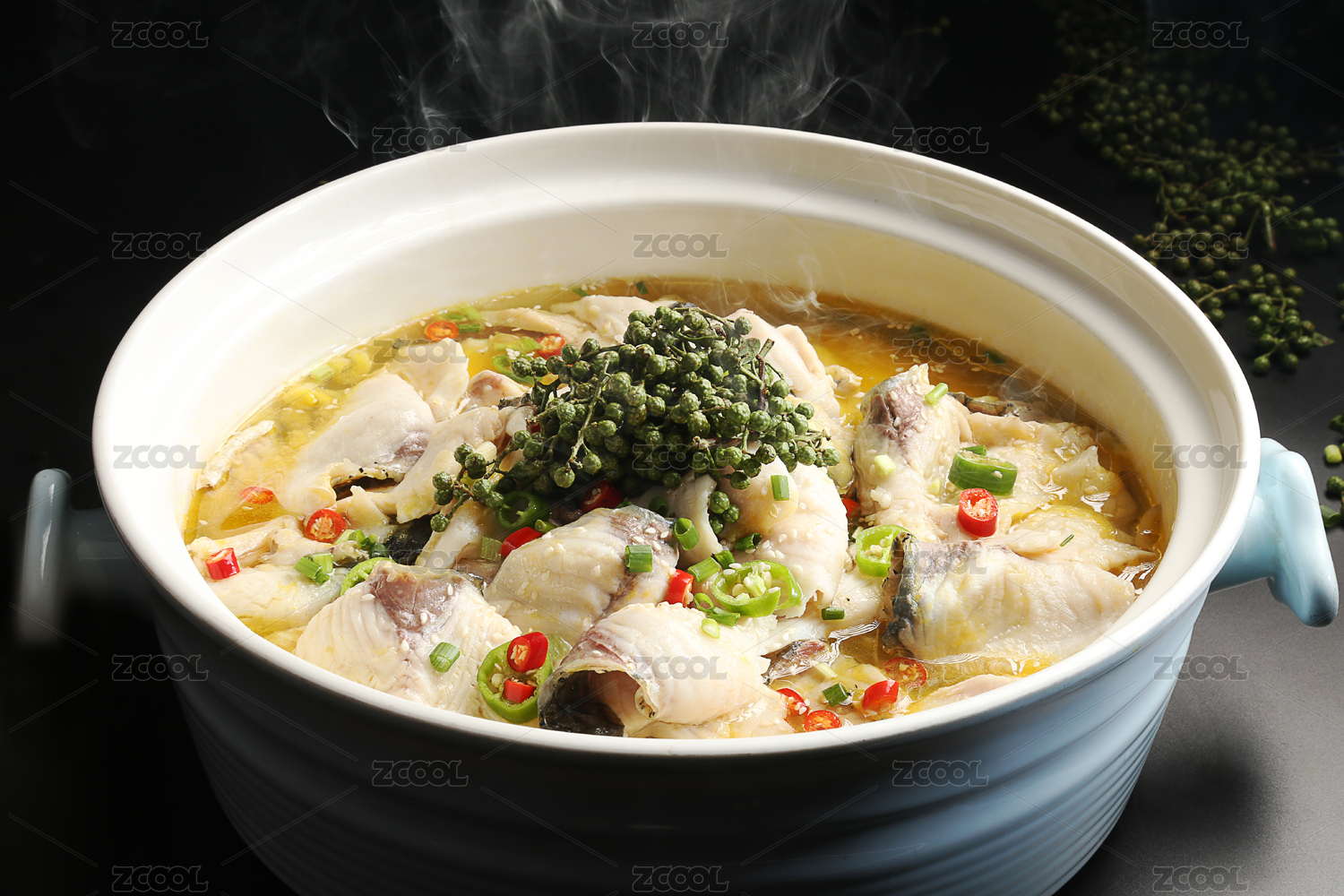 白色圆形瓷锅里面的椒麻青花椒鱼