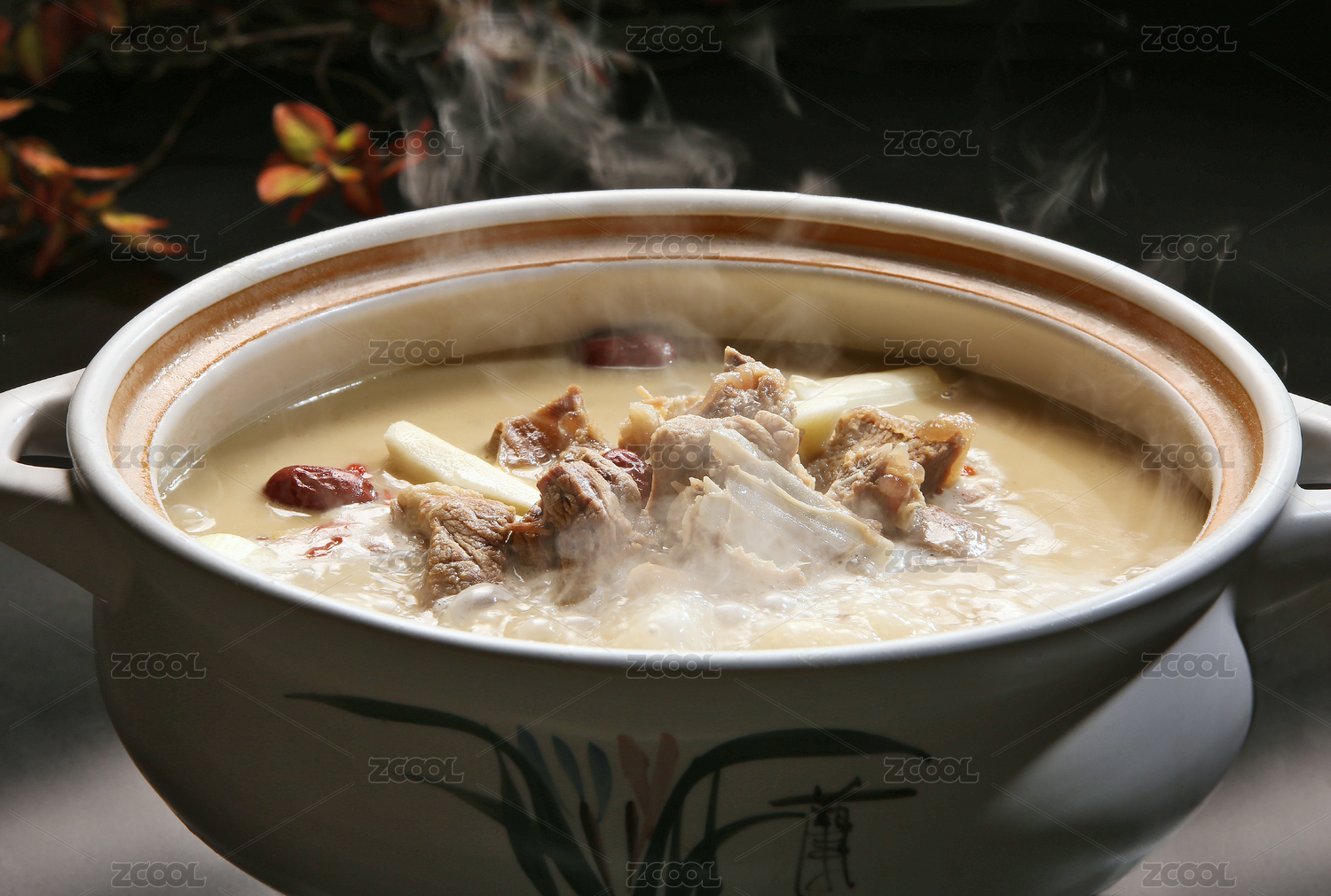 黑色背景上白色汤锅里的冒着热气的排骨藕汤