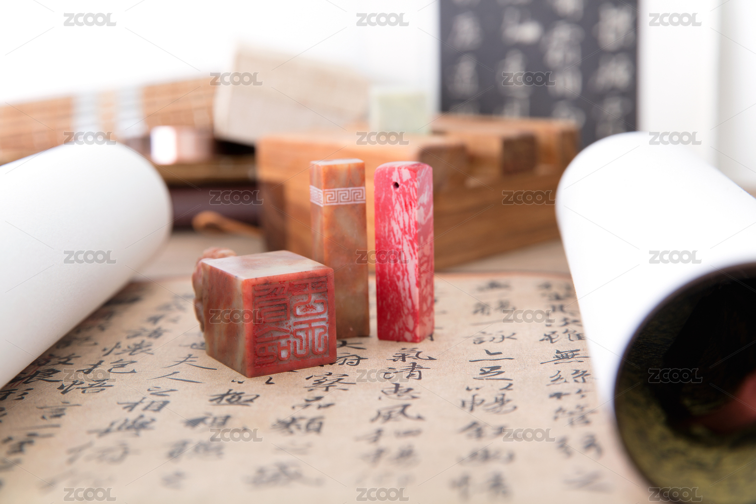 书桌上一卷书法作品和几枚玉石印章