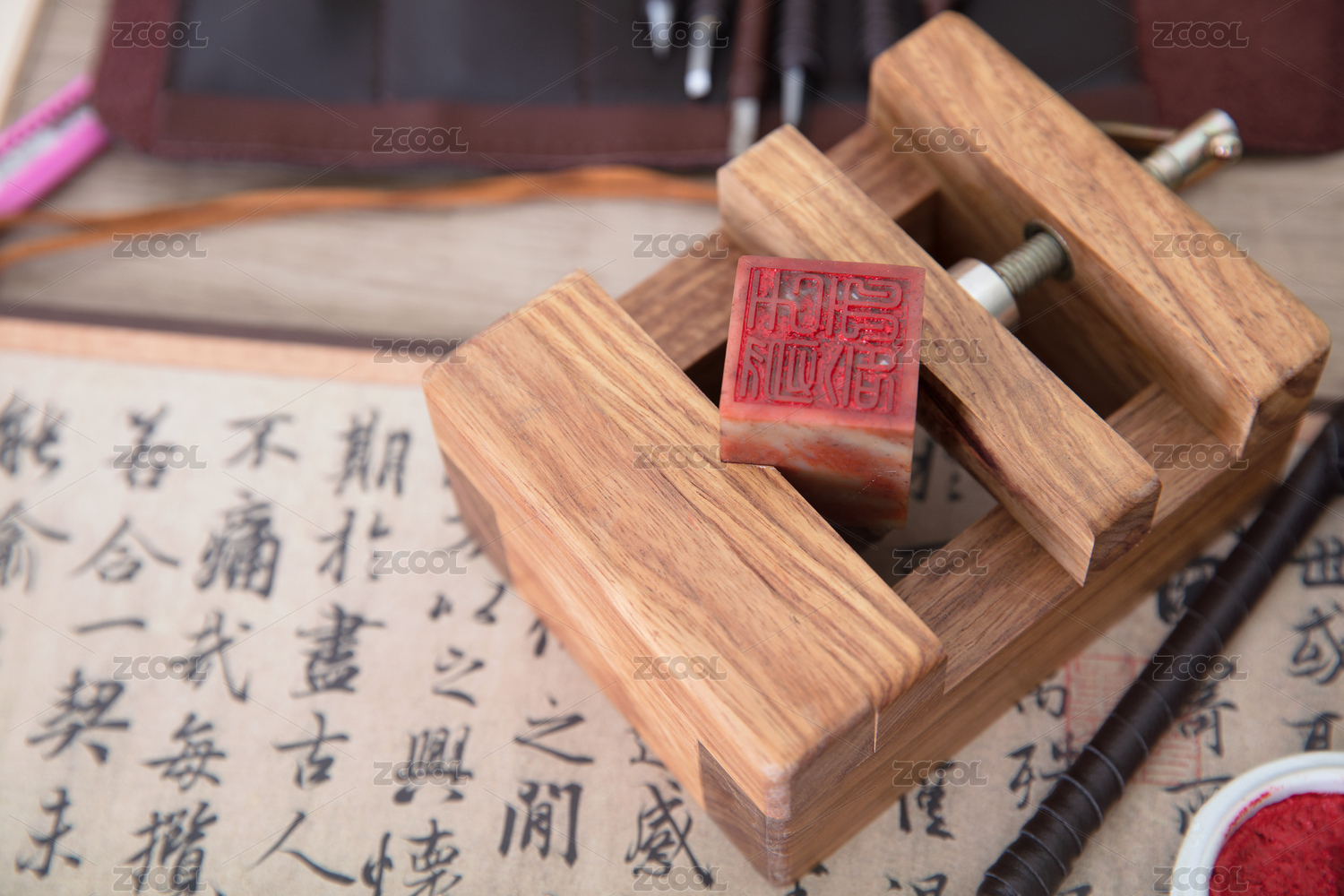 书法背景上一枚印章和一把刻刀