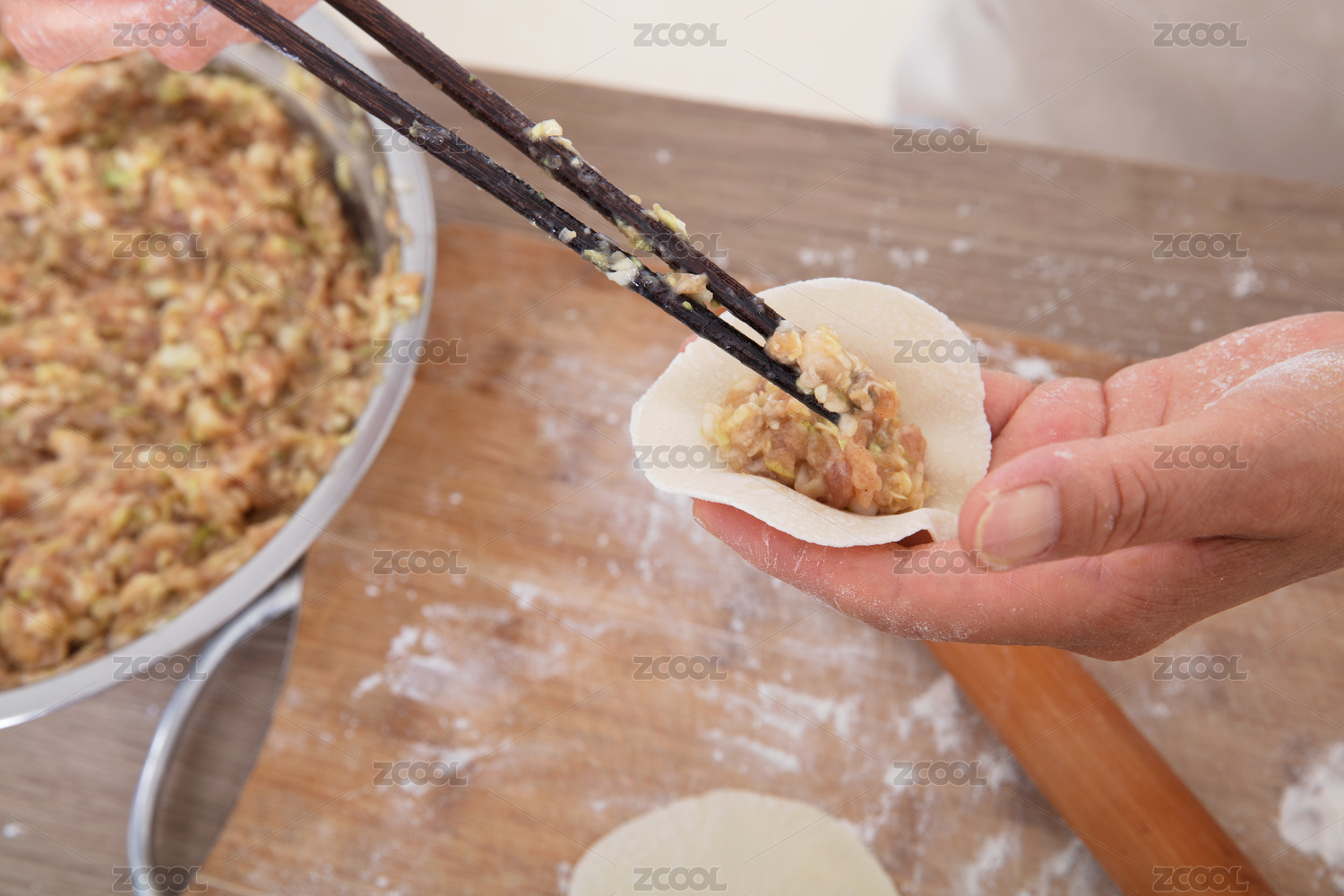 俯视拍摄筷子夹着肉馅放饺子皮上包饺子
