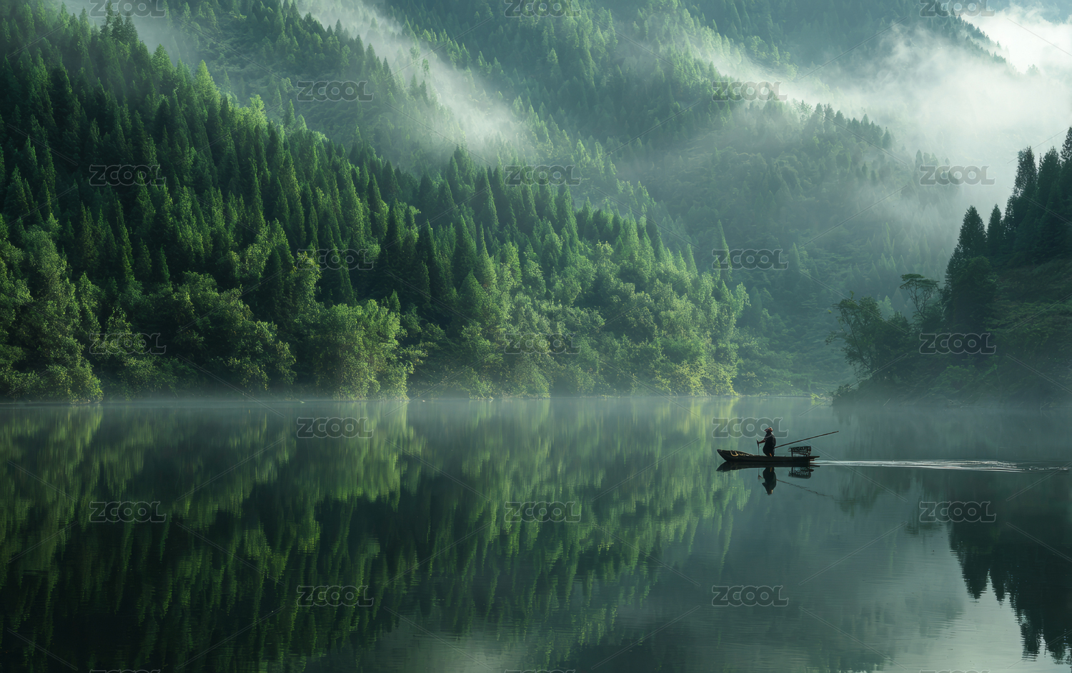 绿色森林山水间湖面小船自然风光