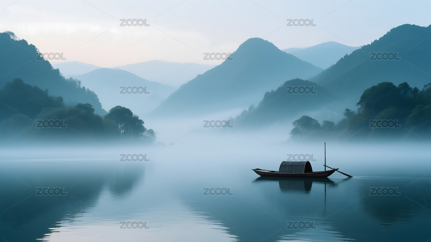晨雾江舟山水画