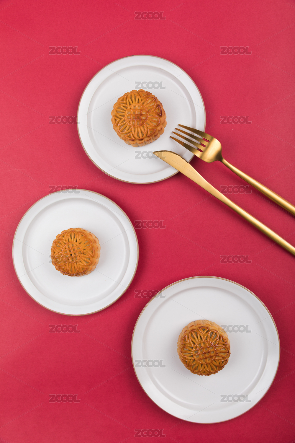 一个放着白色圆盘里的流心月饼,旁边还放着刀叉