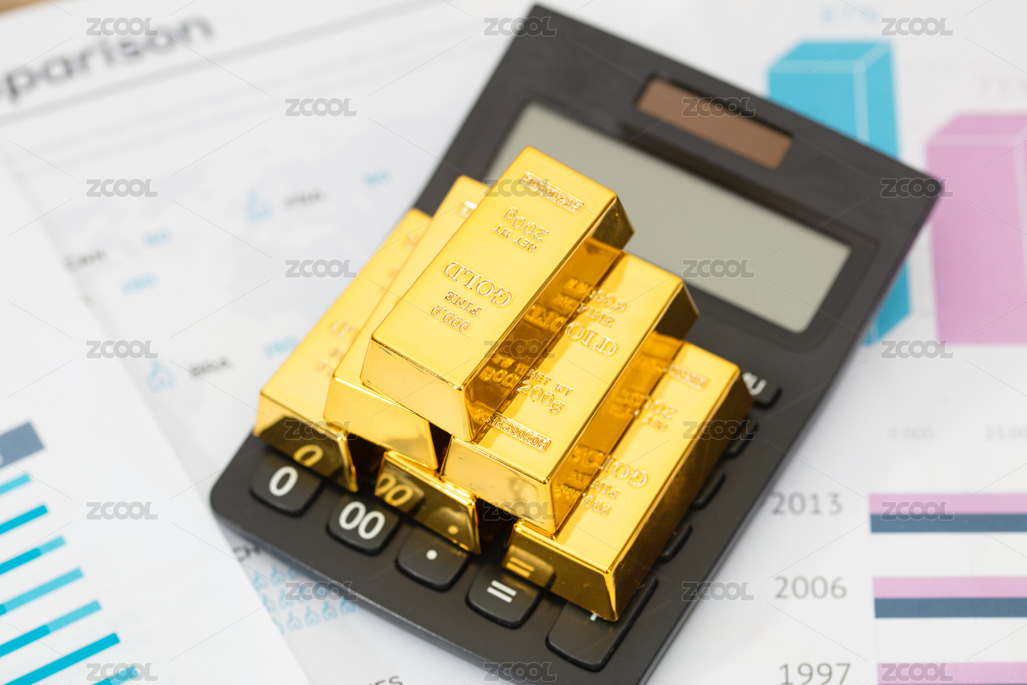 计算器和一堆金块在文件资料上
