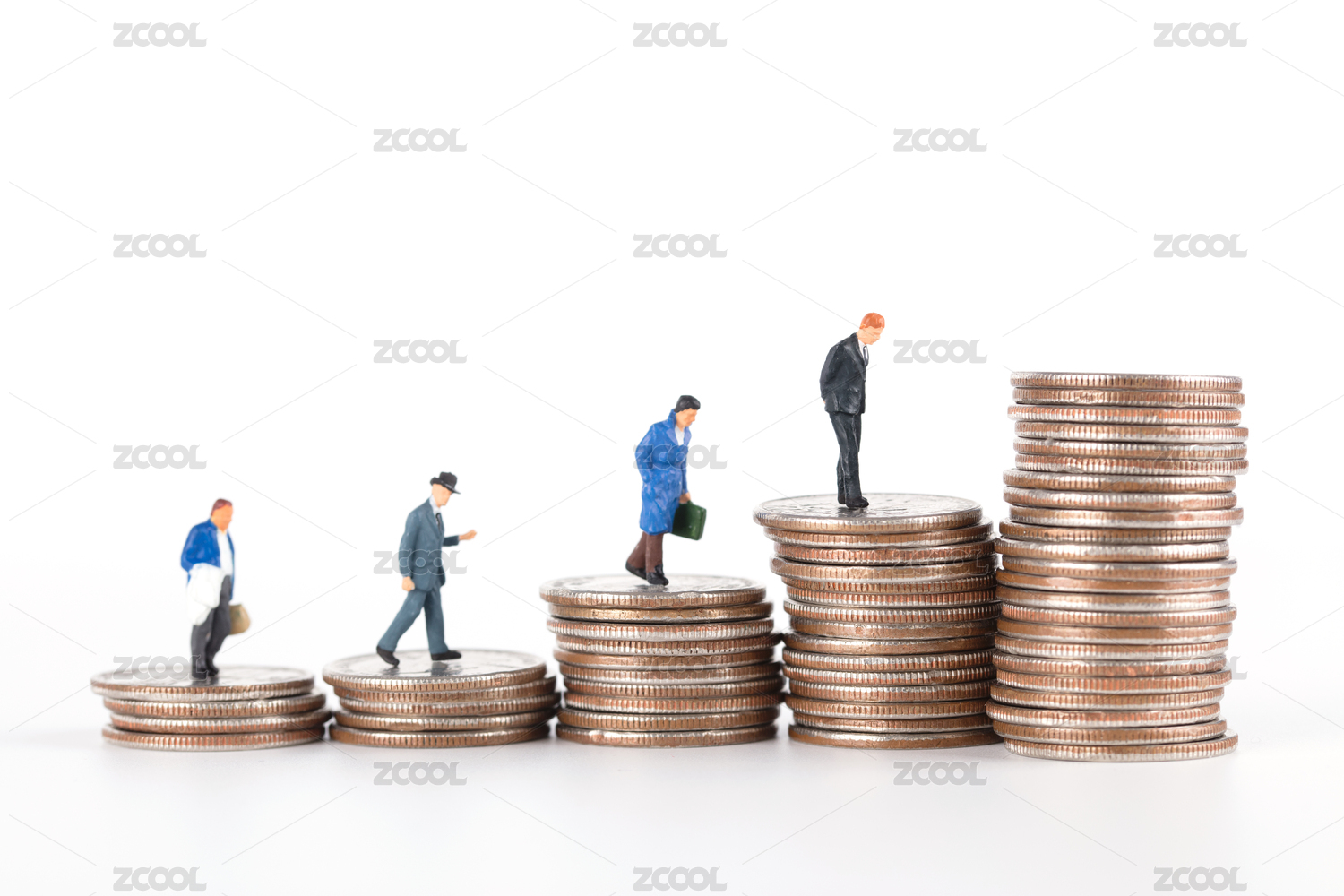 白背景上奔跑的微缩人偶跑向一排逐渐升高的