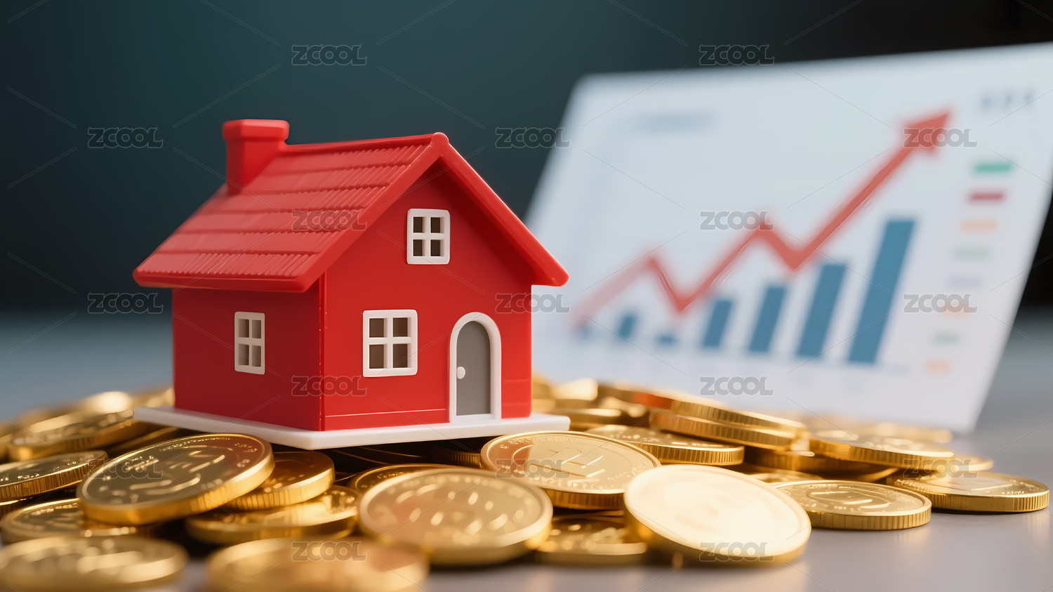金融图表环境下的计算器和被硬币顶起来的小房子模型