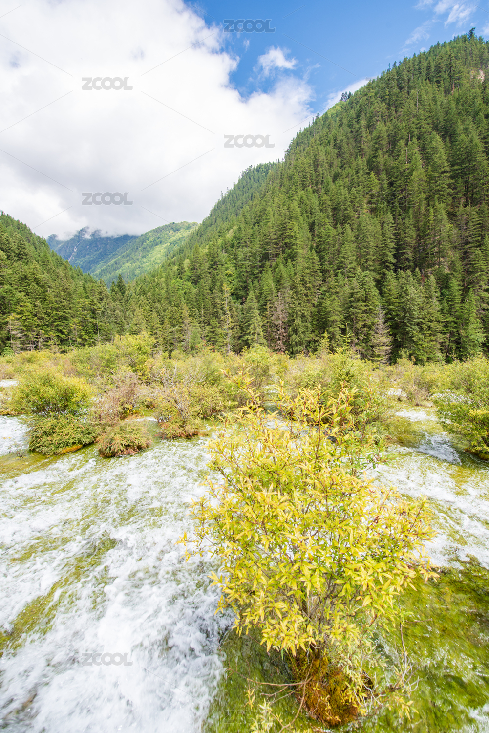四川,九寨沟,溪流,树木,水流,动感,云杉,山坡,流水,晴朗