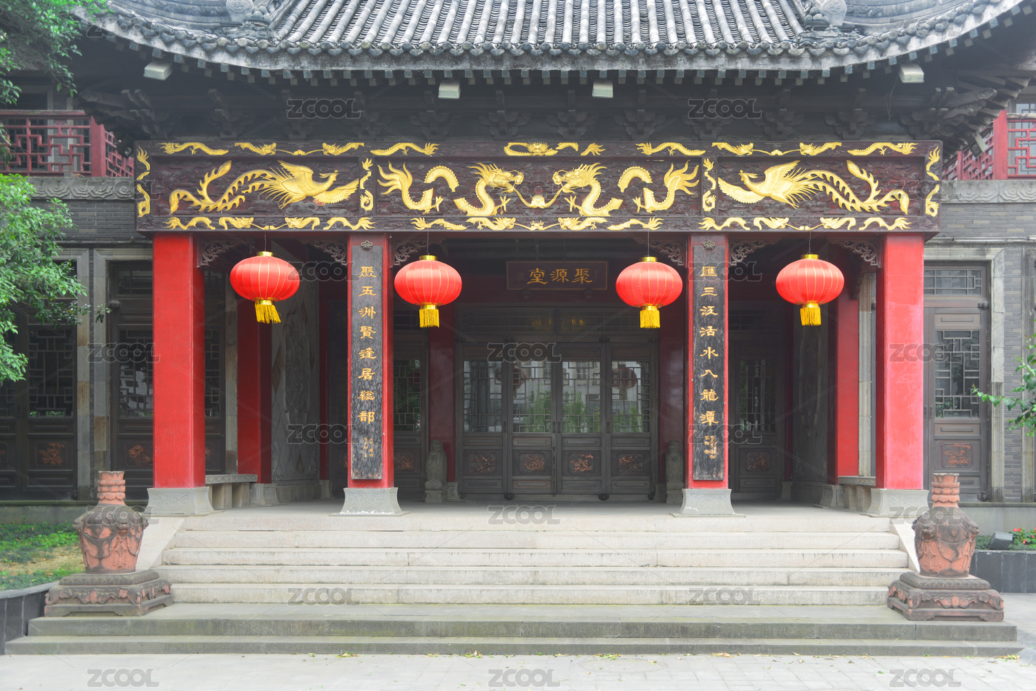 四川成都龙潭水乡传统门庭金漆雕花龙凤木刻