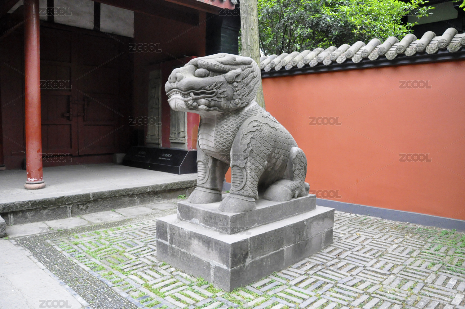 寺庙门口的的石雕狮子坐像