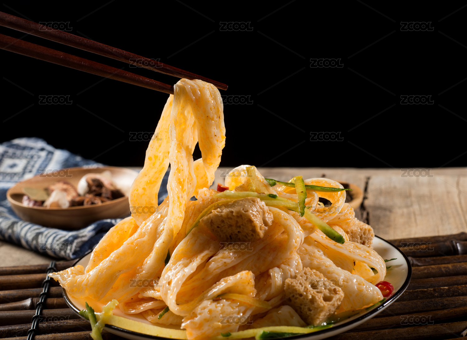 深色背景上筷子夹起的凉拌面皮
