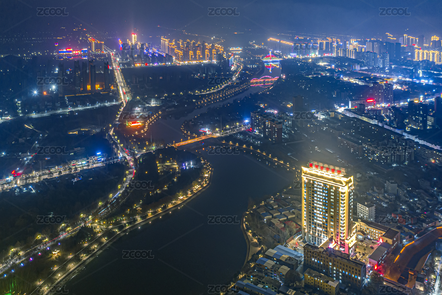航拍中国河南省禹州市市区五彩斑斓的夜景