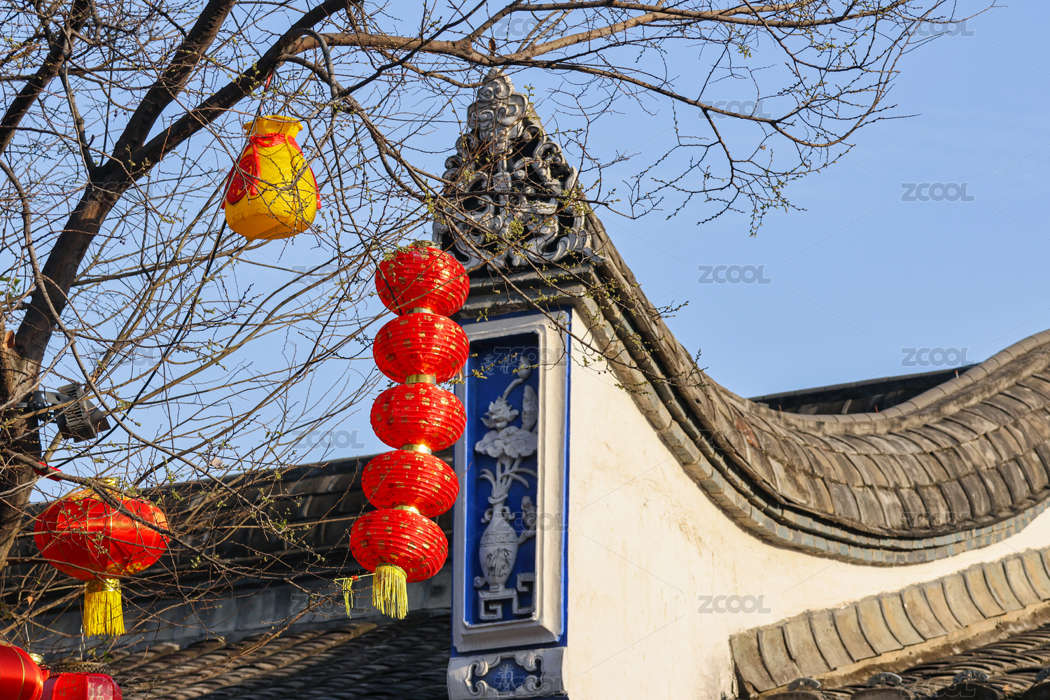 中国春节传统建筑和屋外悬挂的红灯笼