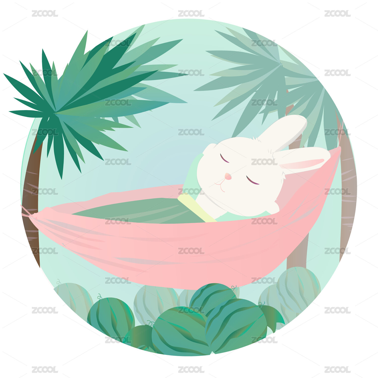 立秋汉服绿色襦裙白兔在椰子树西瓜田露营