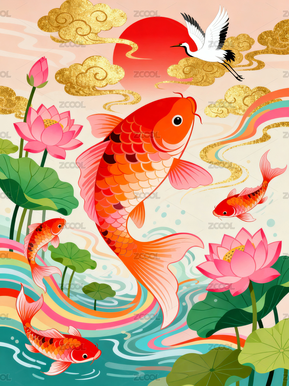 锦鲤荷花红日祥云仙鹤
