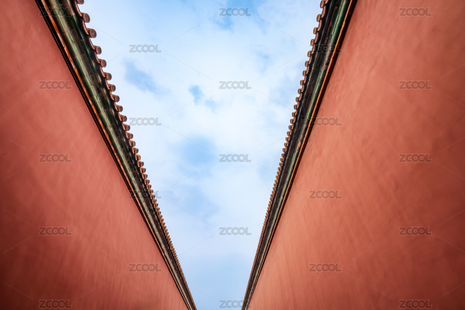 中国北京故宫红色城墙上的东方古代建筑阁楼
