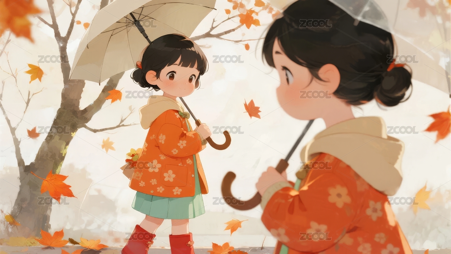 秋日落叶小女孩