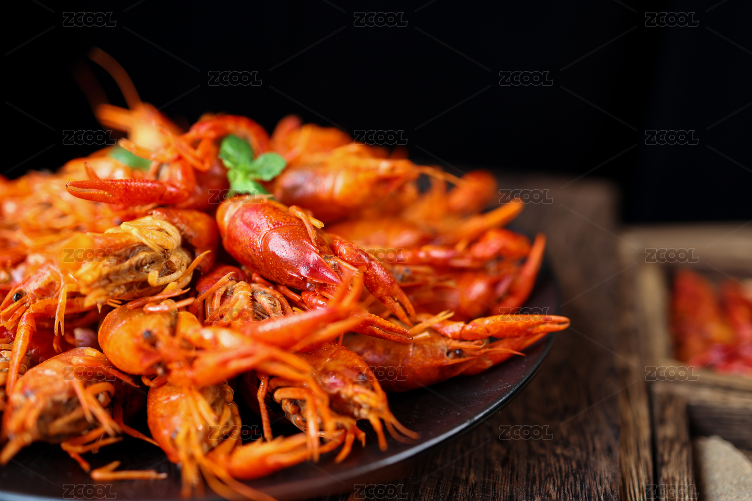 暗调背景里的一盘熟的小龙虾