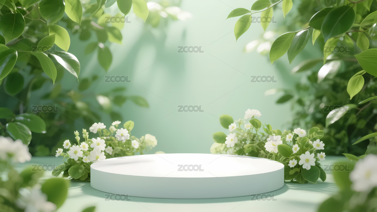 绿色背景白色花与展台