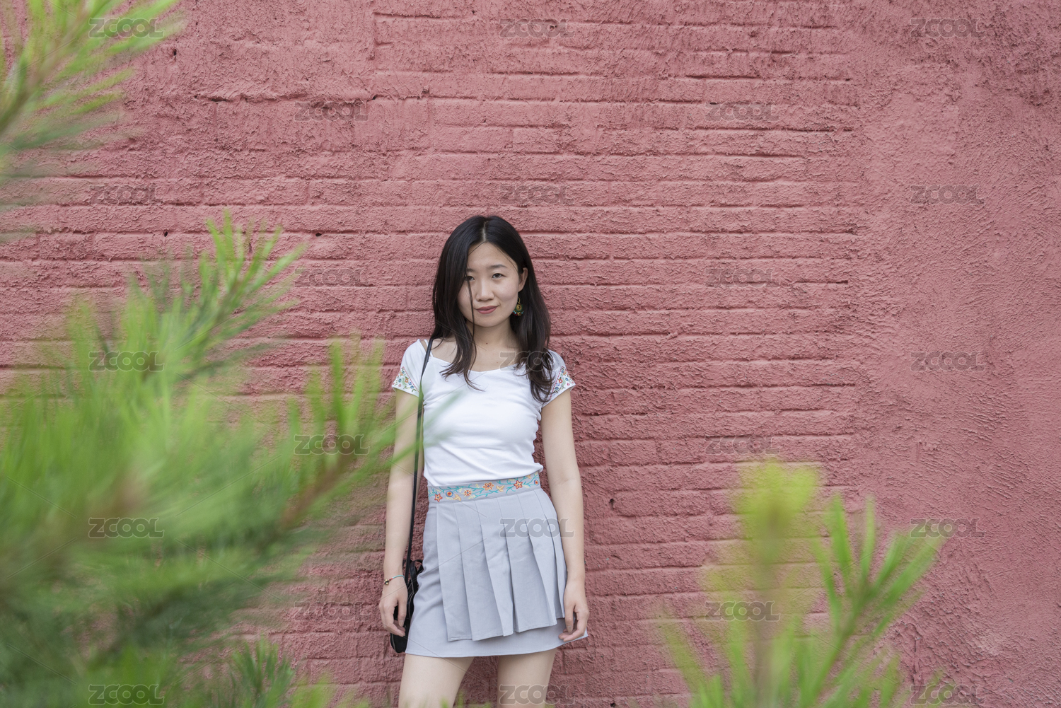 春天在北京798艺术区穿连衣裙的年轻女孩