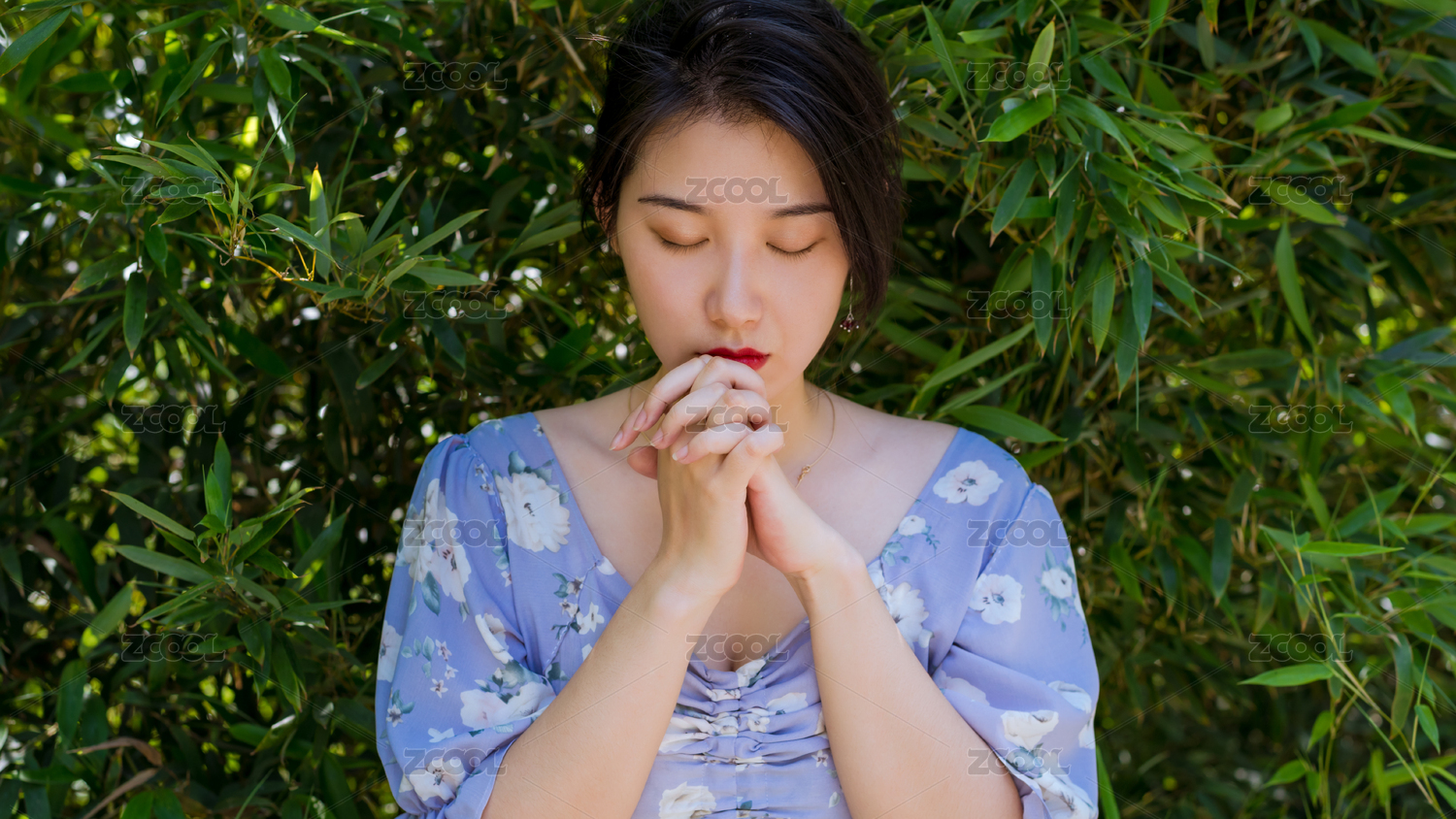 年轻的亚洲女性在祈祷和竹叶背景,夏天户外