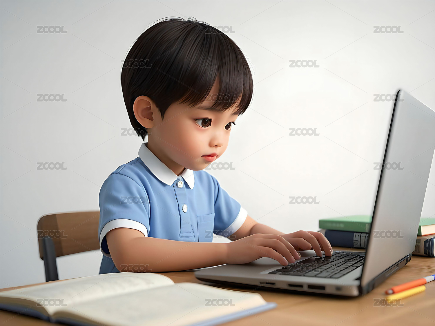 3D卡通风格坐在桌前微笑使用电脑的儿童