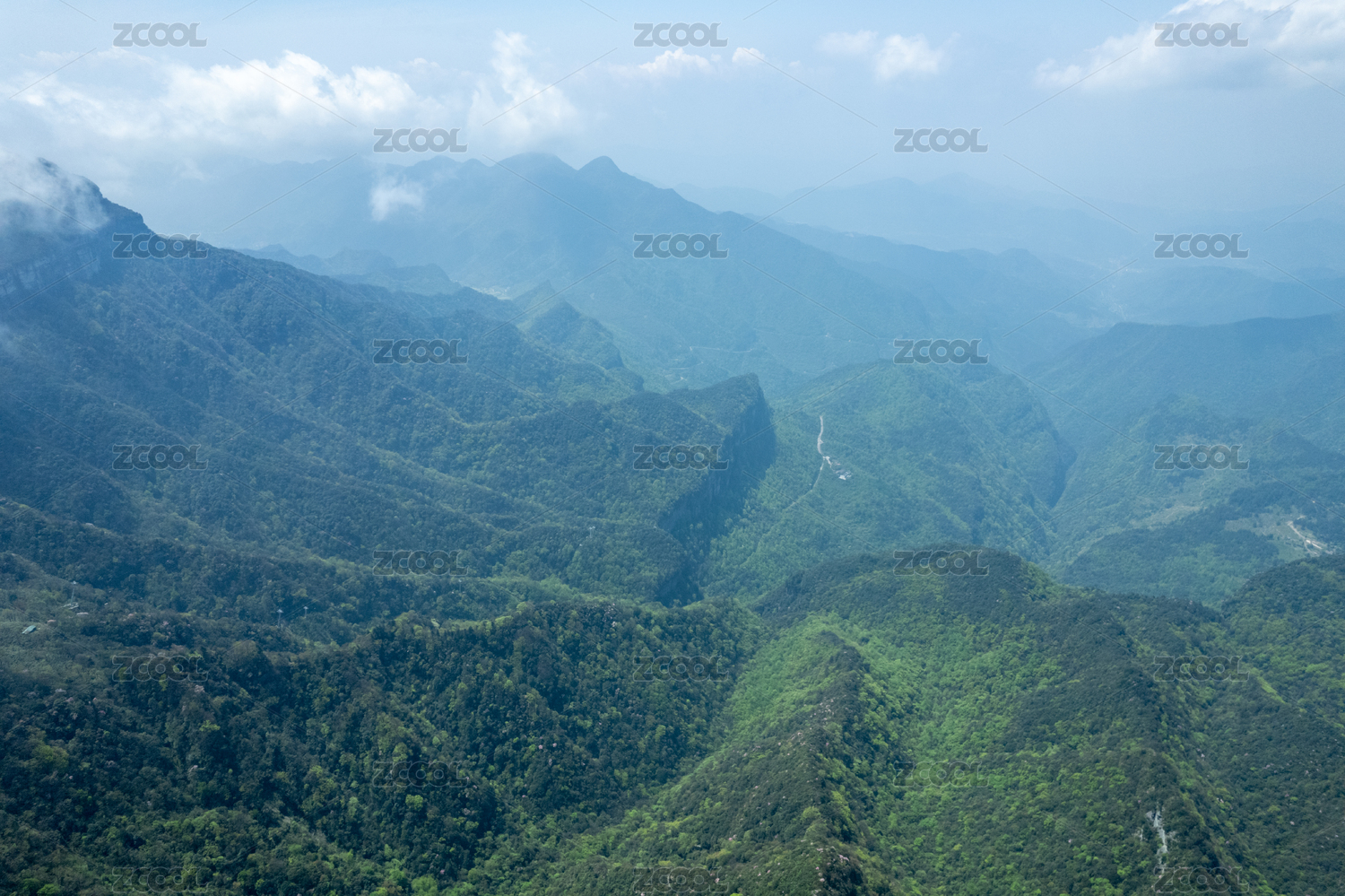 蓝天白云下映衬下的绿色山峰