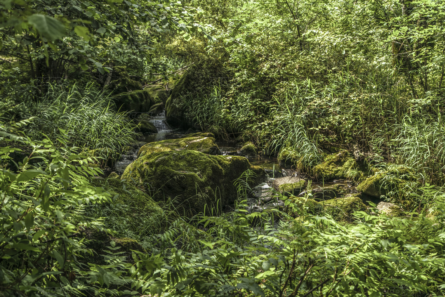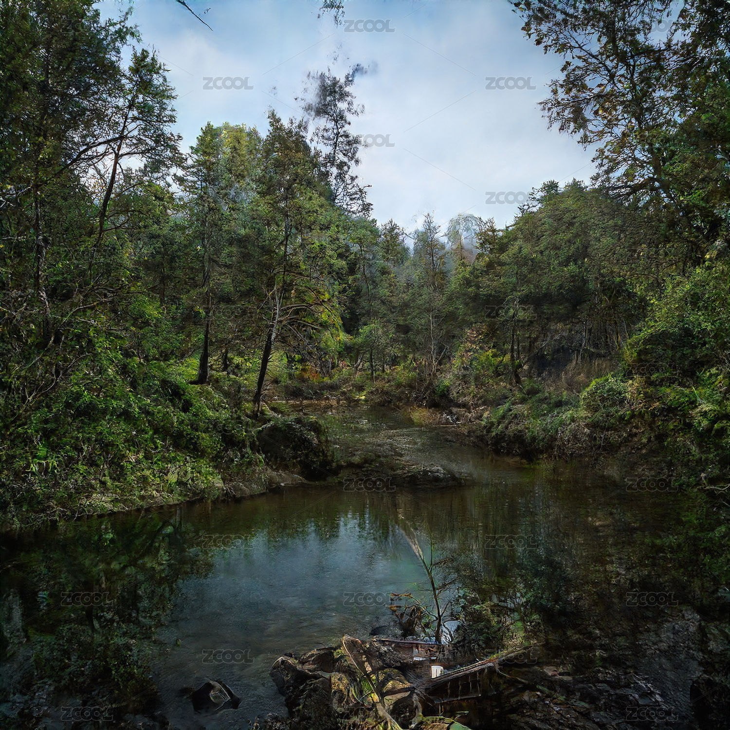 中国大兴安岭密林中长满青苔的水潭