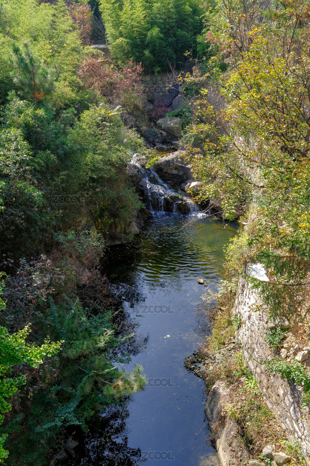 春天户外的山涧溪流与绿色枫树