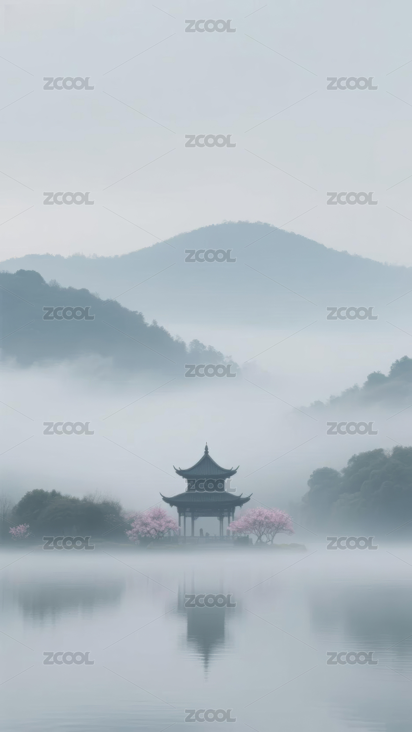 山水画,水墨画,意境,蓝色,湖泊,山峰,宁静,祥和,和谐,传统文化